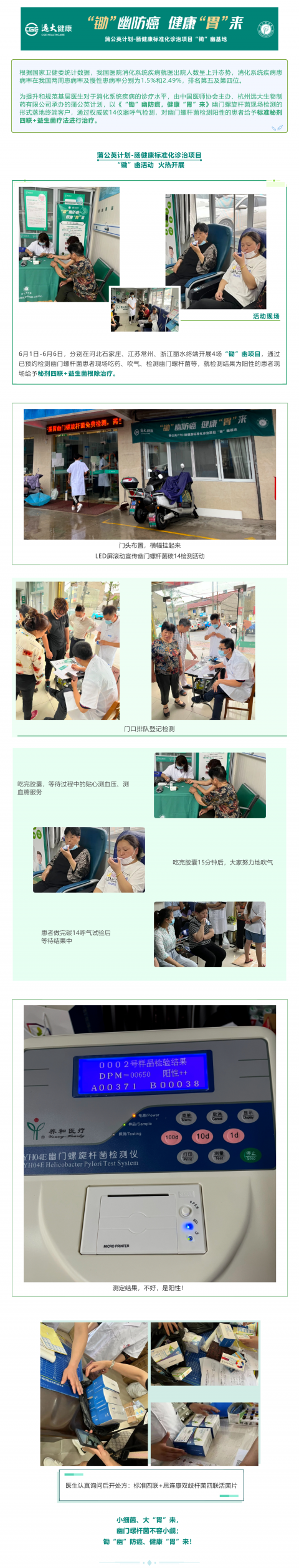 為提升和規(guī)范基層醫(yī)生對(duì)于消化系統(tǒng)疾病的診療水平,由中國(guó)醫(yī)師協(xié)會(huì)主辦、杭州遠(yuǎn)大生物制藥有限公司承辦的蒲公英計(jì)劃,以《“鋤”幽防癌,健康“胃”來》幽門螺旋桿菌現(xiàn)場(chǎng)檢測(cè)的形式落地終端客戶,通過權(quán)威碳14儀器呼氣檢測(cè),對(duì)幽門螺桿菌檢測(cè)陽性的患者給予標(biāo)準(zhǔn)秘劑四聯(lián)+益生菌療法進(jìn)行治療。